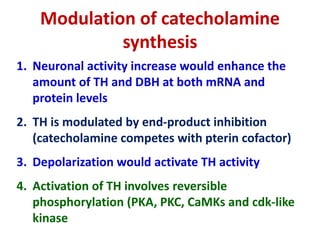 Both turn on factors hormonal humoral and neural stimuli and turn off factors feedback inhibition and others may be modulated by the activity of the nervous system. Following secretion into blood the catecholamines bind loosely to and are carried in the circulation by albumin and perhaps other serum proteins. Once secreted the catecholamines not only enter the blood but also have a feedback effect on the secretory cell elevating cAMP levels and activating tyrosine hydroxylase.